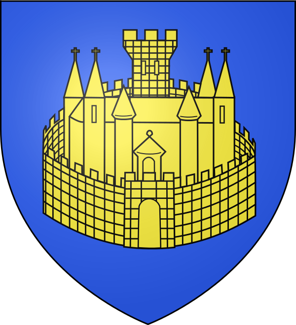 D’azur à une cathédrale avec quatre flèches, derrière laquelle s’élève un beffroi entouré de murailles, le tout d’or.