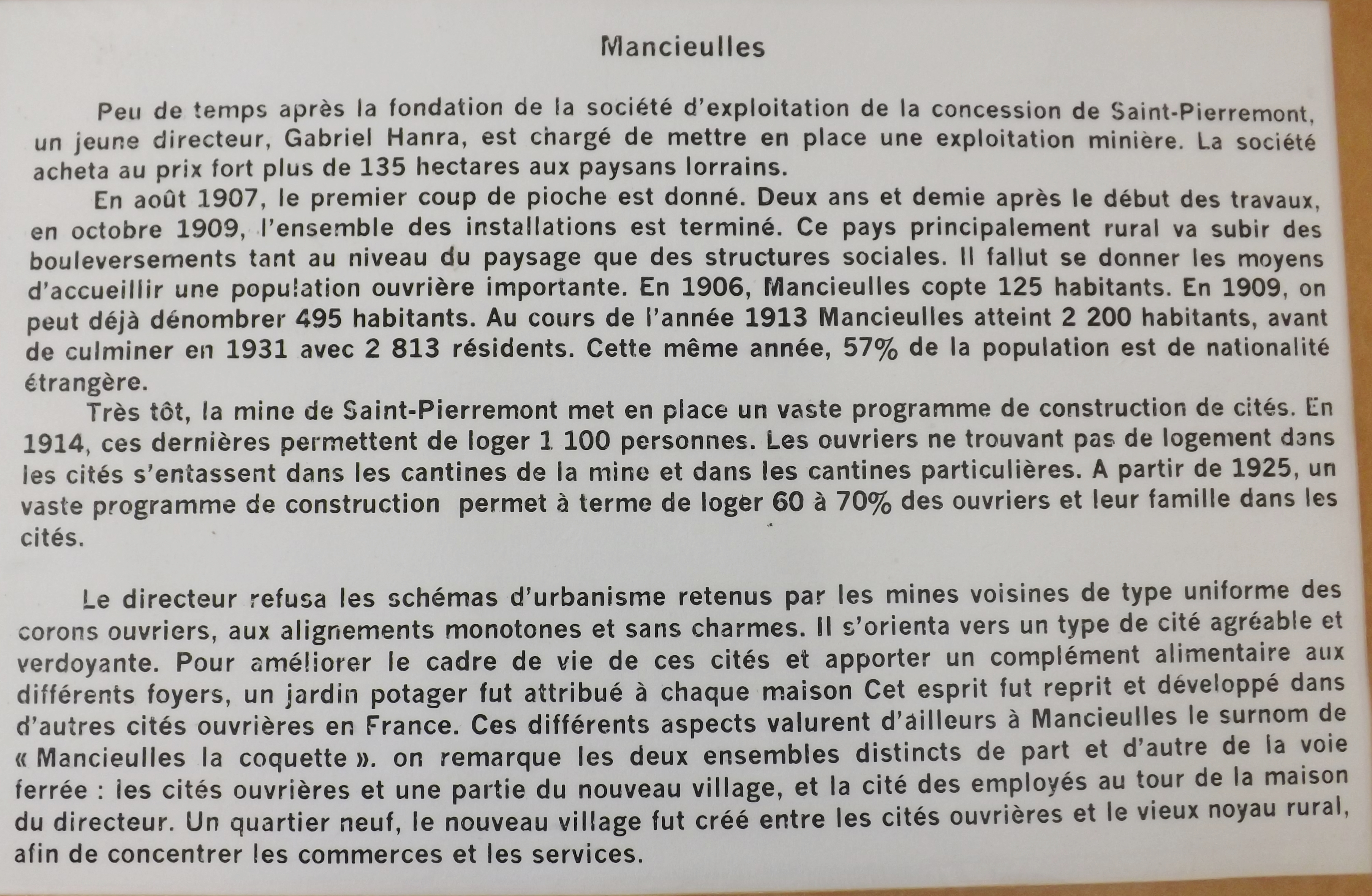 Pour pouvoir loger l’arrivée massive de mineurs français et étrangers, la direction de la mine fit construire un quartier, « Les Cités »,en dehors du vieux village. Petit à petit Mancieulles s’étend et va acquérir le statut de commune en 1910.