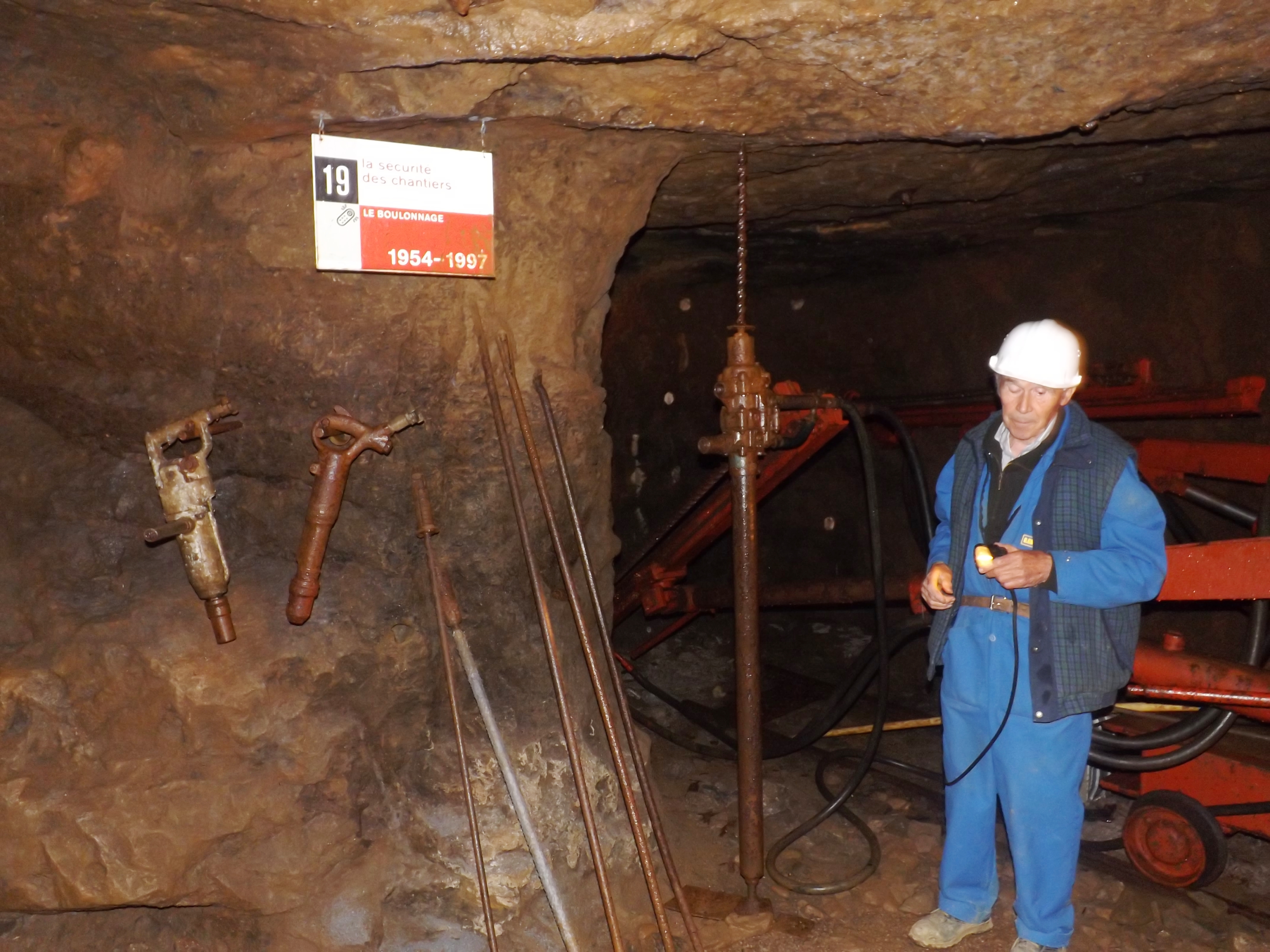 Lorsque nous arrivons un groupe vient juste de partir pour la visite des galeries (on est partis un peu à la bourre) mais le monsieur à l’accueil est charmantissime. Il nous reçoit avec le sourire, nous dit que nous rejoindrons le groupe, il donne une madeleine à Matthieu et malgré nos blousons il nous emmitoufle dans des blousons supplémentaires. Un casque sur la tête et nous suivons un monsieur qui va nous faire rattraper le groupe déjà dans la mine.