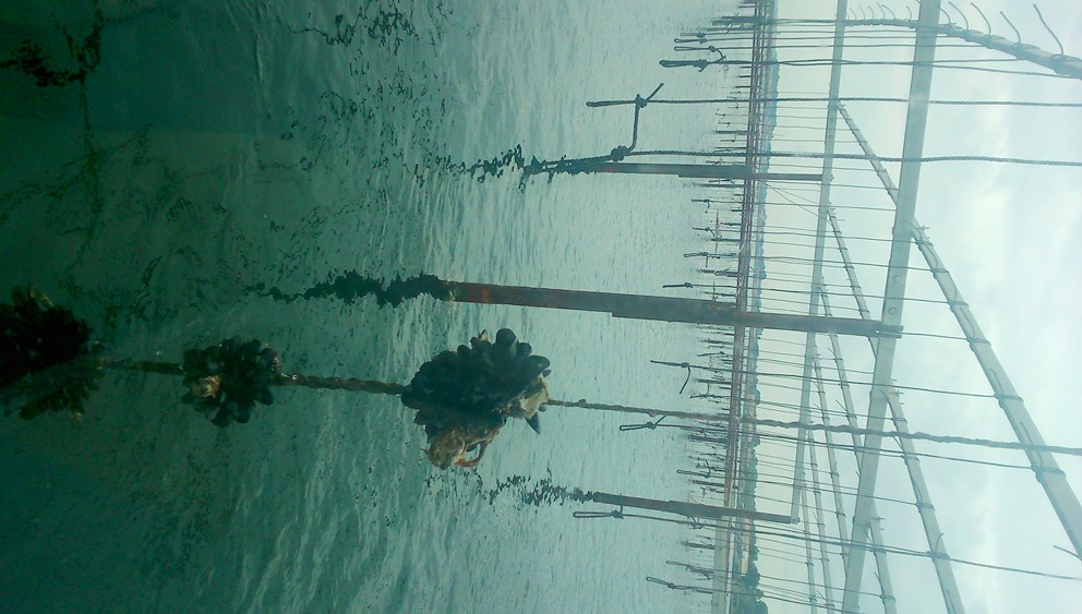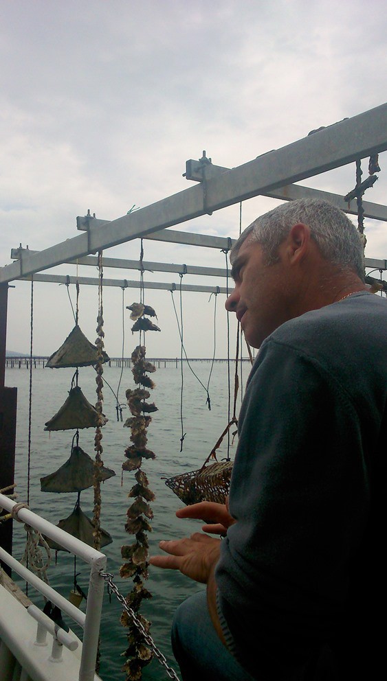 Le bateau s’accoste à un parc aménagé, le capitaine-ostréiculteur nous explique son métier. Sur les cordes se trouvent les naissains (petite huîtres) et les graines (petites moules). Il sort de l’eau les cordes les unes après les autres afin que nous puissions voir les différentes stades d’évolution.