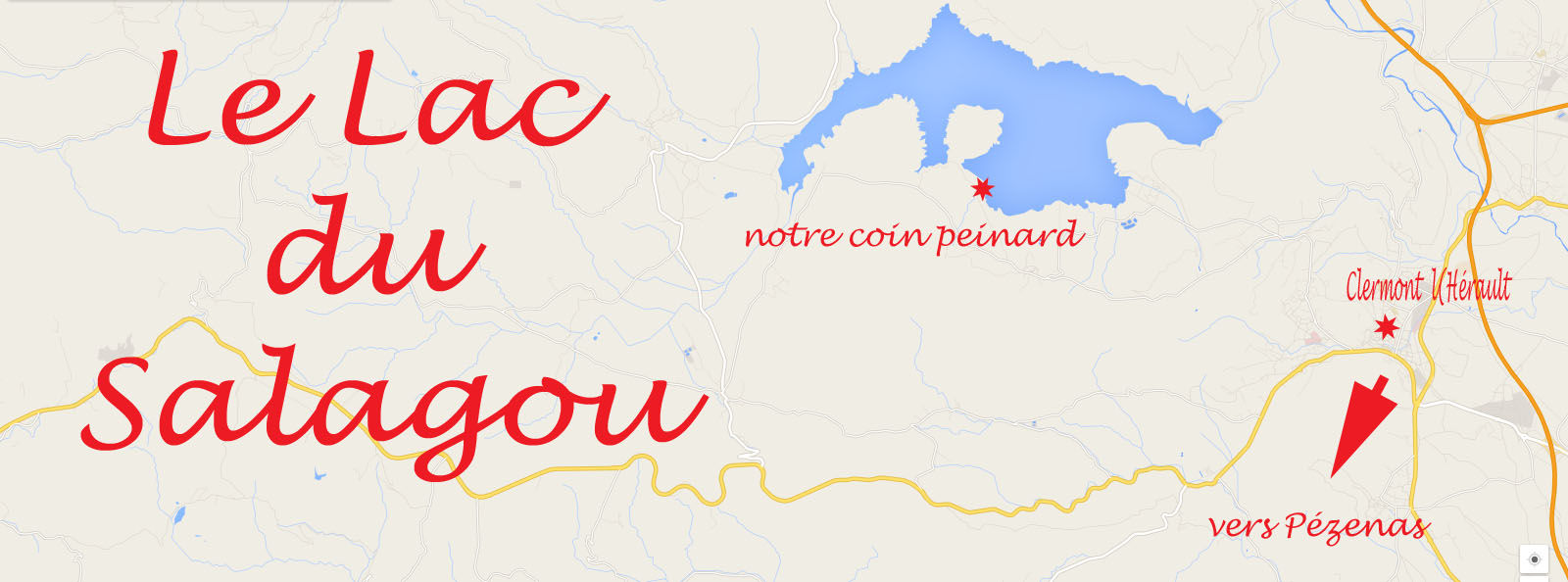 Le lac du Salagou se situe à environ 30 kms de Pézenas, c’est un lac artificiel qui fut érigé à la fin des années 60 pour constituer une réserve d’eau utile à l’irrigation et pour lutter contre les crues de l’Hérault.   Aujourd’hui, en plus de ces vocation initiales, il a des fonctions diverses : activités touristiques, production hydroélectrique, lutte contre l’incendie…  Il a une superficie de 750 hectares et une longueur de 6 kilomètres.