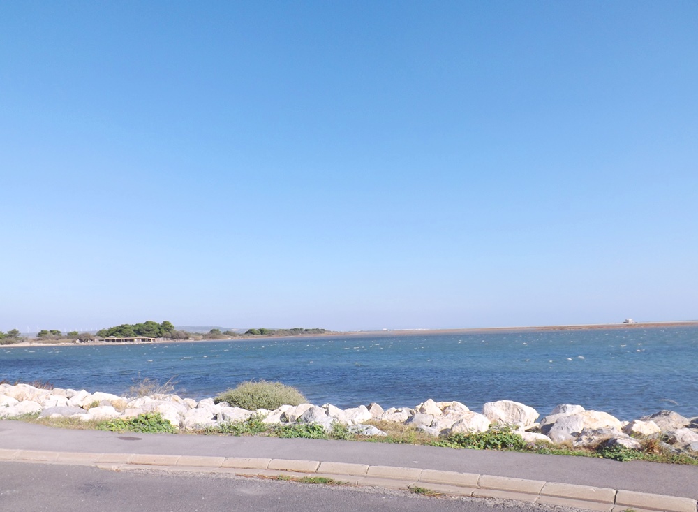 Nous stationnons sur le parking pas complètement désert, le lieu accueille les amateurs de sport venteux et aquatiques.