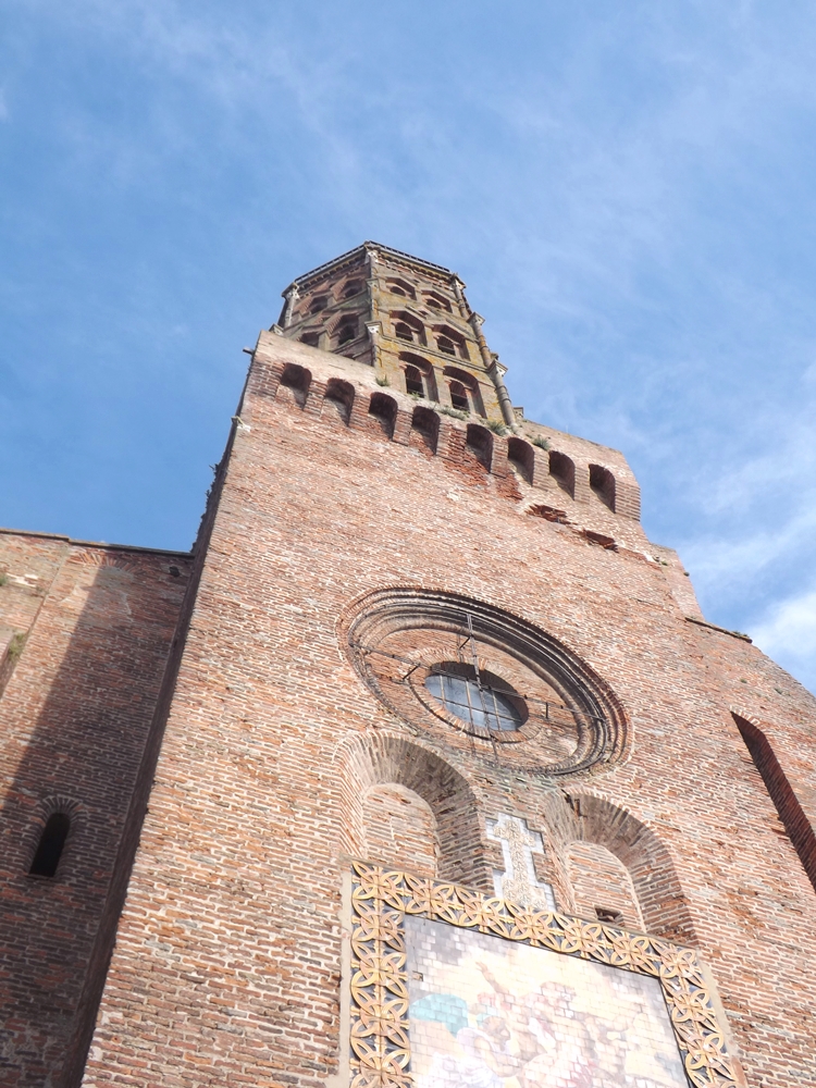 Nous n’avons pas encore visité l’intérieur mais sa façade est vraiment imposante et porte les traces de l’histoire tumultueuse de la ville. Construite au XIIIème siècle elle portait une voûte romane qui s’effondrera après la guerre de Cent Ans et sera remplacée par une voûte gothique. Mais patatras voilà les guerres de religion. Montauban sera un des places fortes des Protestants, les calvinistes abattent la voûte et la flèche. En 1621 Louis XIII fait le siège de la ville et envoie des boulets de canon sur la base fortifiée du clocher octogonal. On voit encore les trous laissés par les boulets.