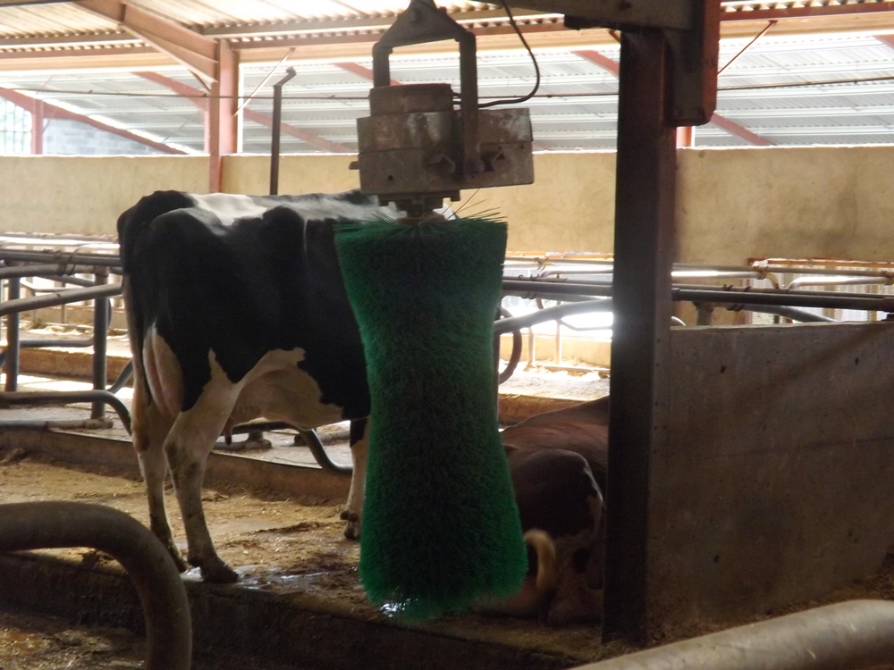 Ici les vaches sont libres, elles peuvent entrer et sortir de l’étable à leur guise, rester debout ou s’allonger sur leur natte, en été le toit est arrosé pour ne pas qu’elles souffrent trop de la chaleur.