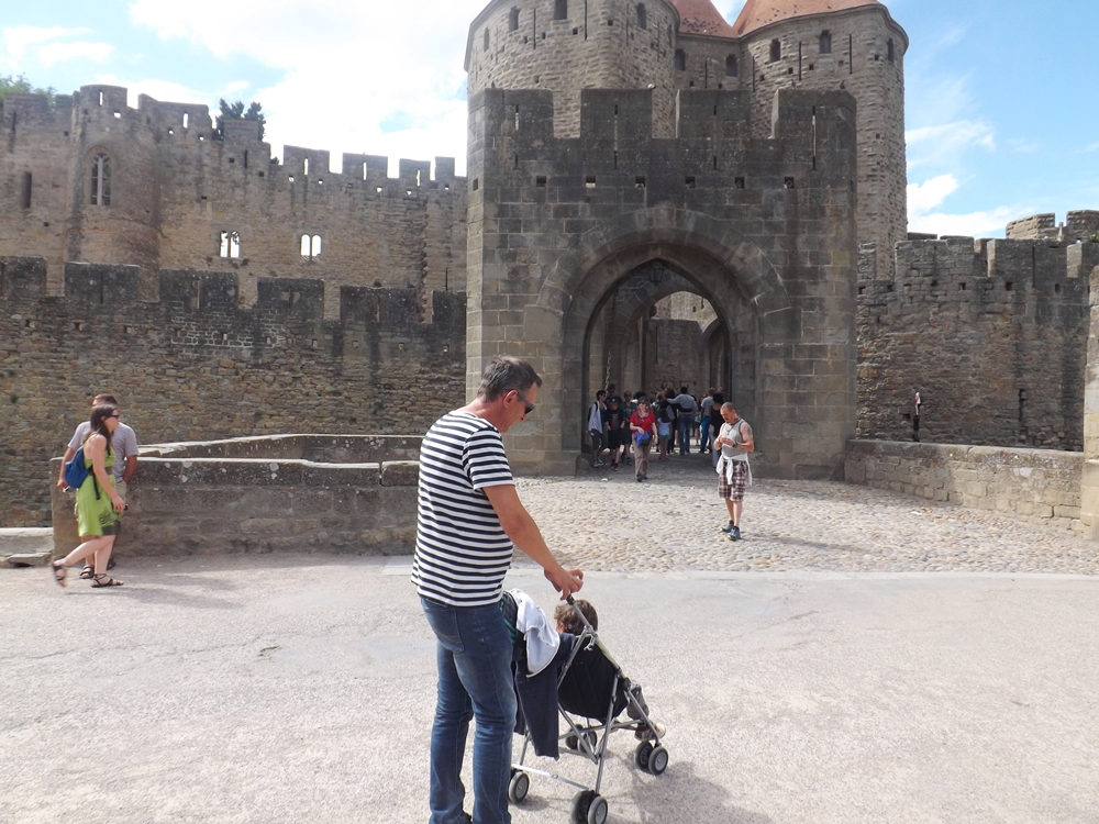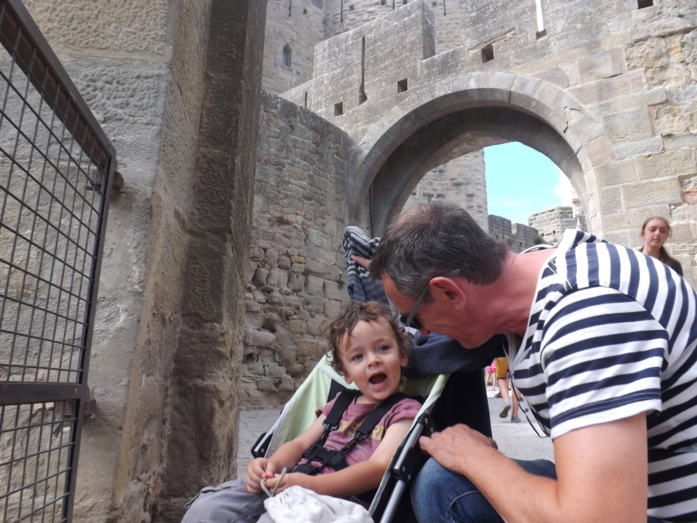 Voilà nous sommes le 23 août notre road-trip prend fin, nous venons de repartir de Montauban dans le Tarn et Garonne où nous avons passé quelques jours chez ma frangine et son conjoint. Nous avons vu Albi, Cordes sur Ciel, Gaillac, ces belles villes du Tarn, et nous sommes désormais dans l’Aude pour voir Carcassonne, non de l’intérieur de la majestueuse cité mais par les remparts, histoire d’avoir un point de vue différent. Ca permet aussi d’éviter la foule qui se presse dans les ruelles étroites, je déteste piétiner et me sentir oppressée. Et puis avec une poussette ça devient vite insupportable. Donc, hop ! Un petit tour de train touristique pour voir les remparts et écouter l’histoire de cette cité incroyable sauvée in extremis de la destruction… J’en frémis rien que d’y penser, cette cité est tellement belle !