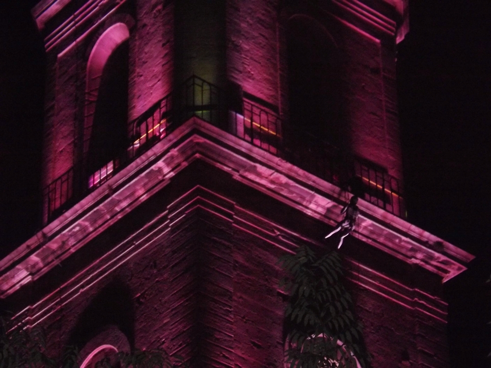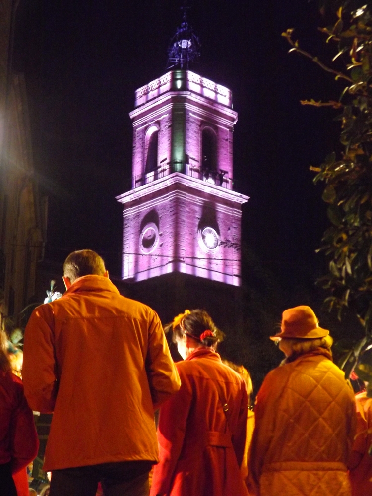 19h sonnent à la collégiale qui se teinte de mauve à la nuit tombée, c’est joli. J’arrive sur la place où il y a déjà un peu de monde, une estrade est dressée. Des photographes avec du vrai matos de photographe ont joué le jeu jusqu’au bout.