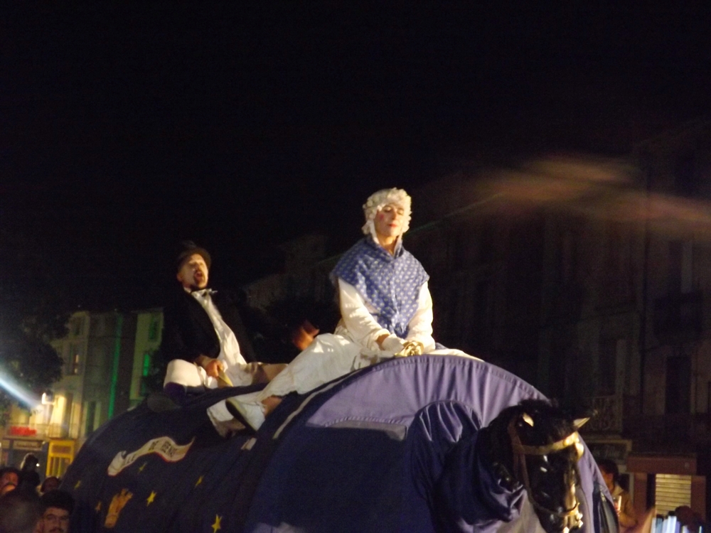 Estieinou et Estieinette descendent de leur monture pour permettre à cette dernière de faire sa danse sur la Place Gambetta