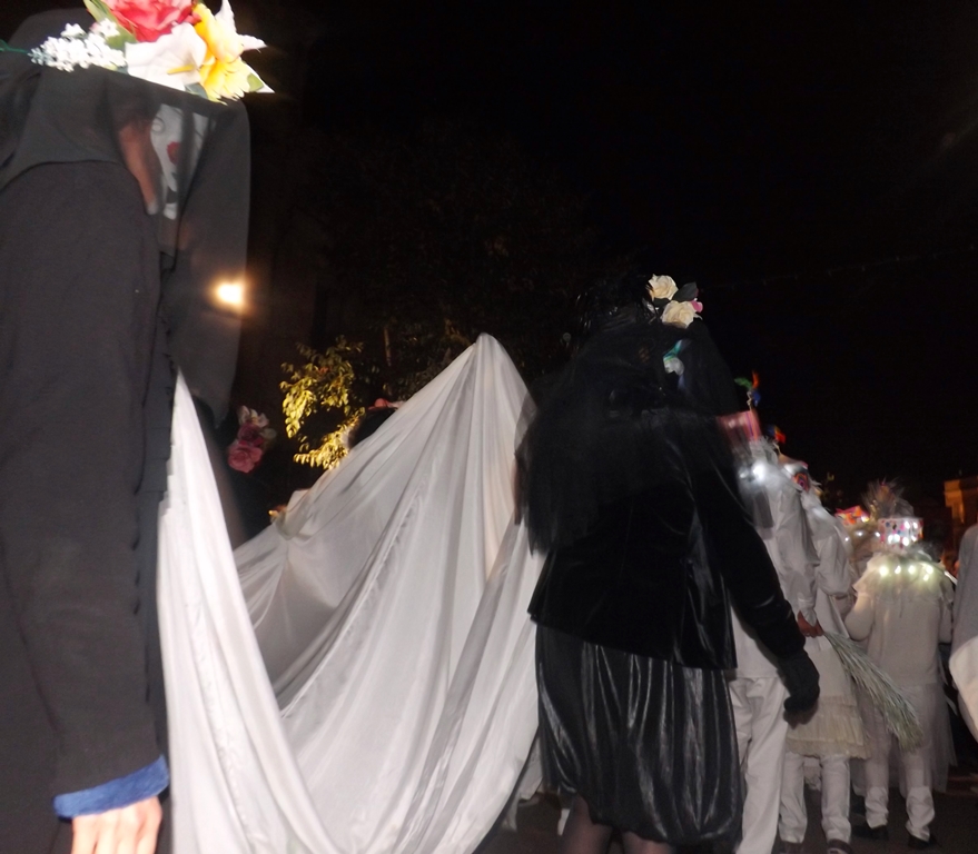 Au son des fifres et tambours les créatures de la Mort et les chanteurs de la Vie dansent, les spectateurs également quand apparaît la star locale, le Poulain tant aimé qui réunit tout le monde.