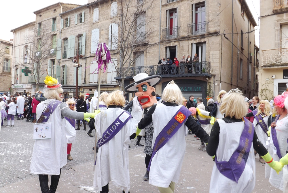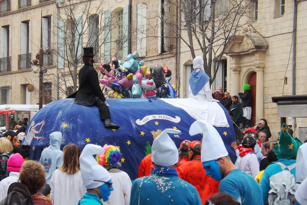 Mardi 9 février c’était Mardi-Gras. Si dans certaines villes cela peut passer complètement passer inaperçu, ici à Pézenas, on ne peut pas l’oublier. A Pézenas, qui dit Carnaval dit sortie du Poulain et charivari tout en déguisements farfelus. Certaines rues sont fermées à la circulation le temps de la procession et les boutiques baissent le rideau. Ce n’est pas le jour pour faire du shopping. Du temps où je travaillais à Pézenas sans y vivre je me rappelle que ce jour était chômé, du coup j’aimais bien. Mon boss de l’époque prévoyait toujours de faire nettoyer le lendemain la vitrine couverte de mousse à raser et de farine. Ce n’est que lorsque je vins vivre ici que je découvris vraiment le Carnaval. D’abord comme accompagnatrice en tant que parent d’élève lors du Carnaval des écoles (la veille). Pour être honnête, au début je n’osais pas participer au grand Carnaval, j’avais les jetons. La foule me fait peur en général, et j’avais moyennement envie de me prendre de la farine et de la mousse à raser dans la figure… J’aurais pu continuer à vivre ici sans participer aux festivités mais mon fils grandissait ici et je voulais qu’il puisse se construire des souvenirs et se créer son appartenance au groupe en tant que petit Piscénois. Du coup je pris mon courage à deux mains, et accompagnai mon fiston au grand Carnaval… Contre toute attente j’en revins vivante, entière, et propre. En fait ce sont surtout les ados qui s’amusent à se couvrir de produits collants, les adultes et les plus petits sont majoritairement respectés. Et puis, relativisons, ce n’est pas bien grave dans le fond…