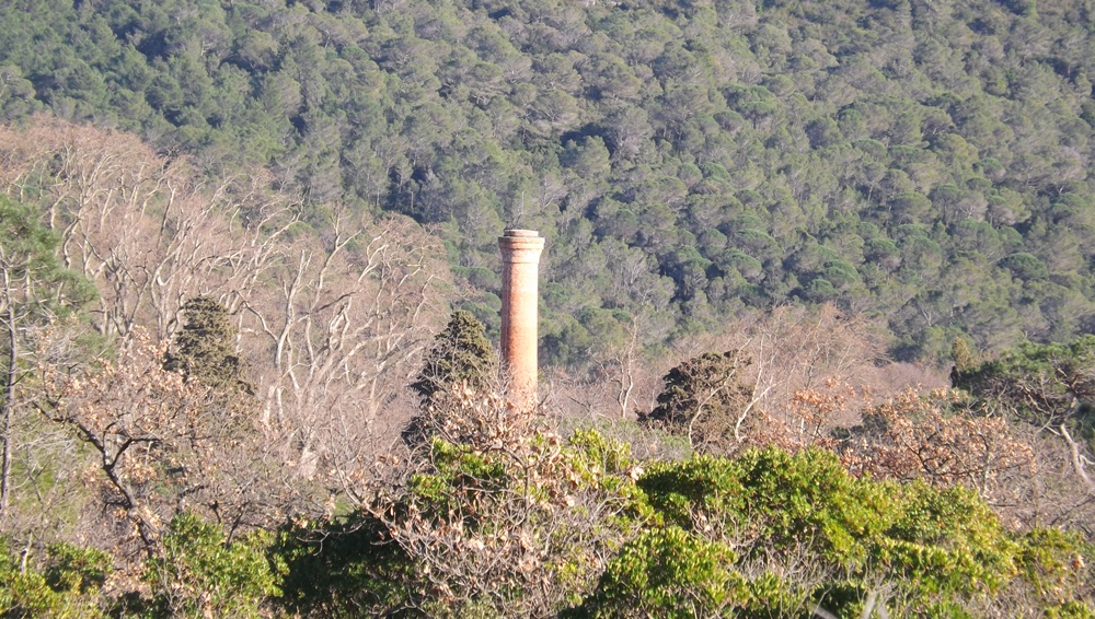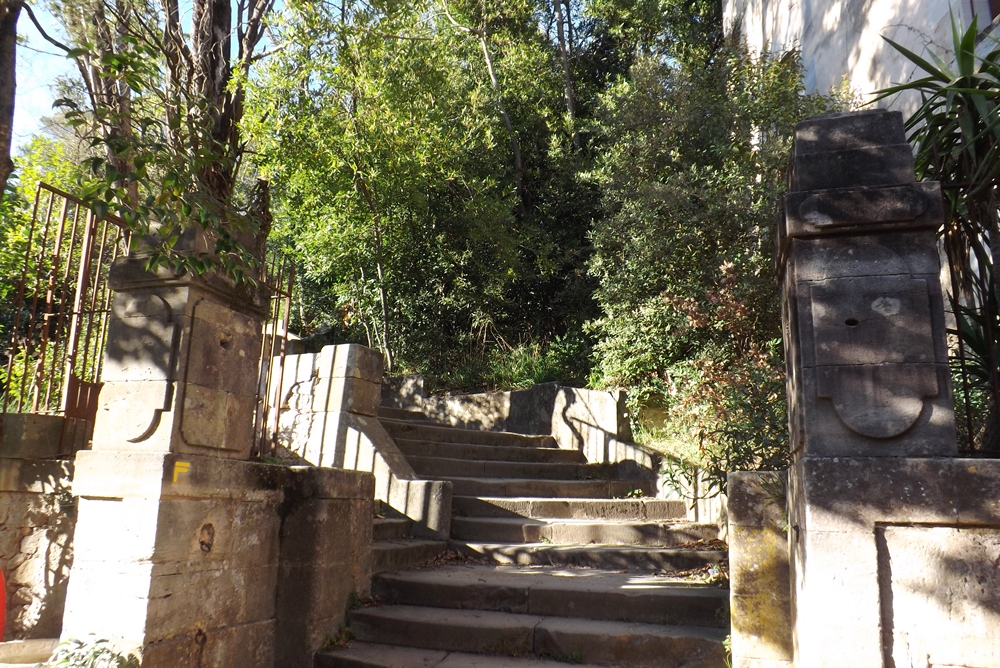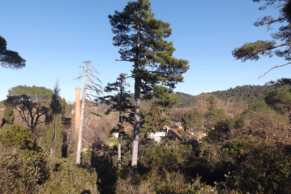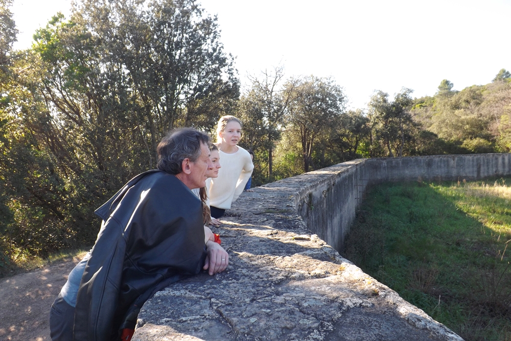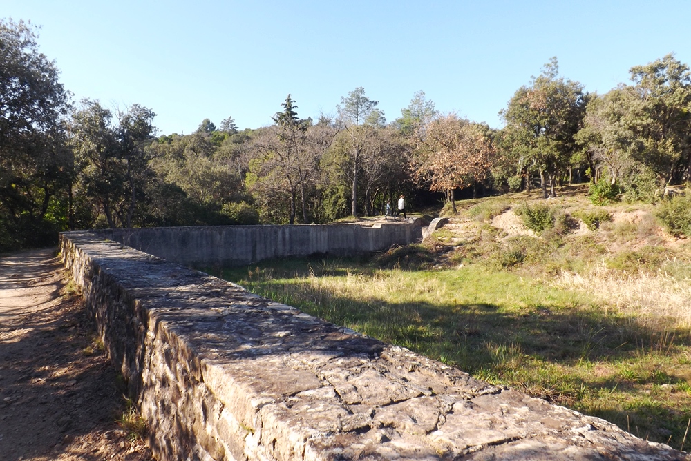 En contournant le buffet d’eau nous grimpons dans la colline qui contourne Villeneuvette. Une balade agréable dans la garrigue qui nous mène dans un premier temps vers l’ancien bassin et le système hydraulique qui alimentait la Manufacture.