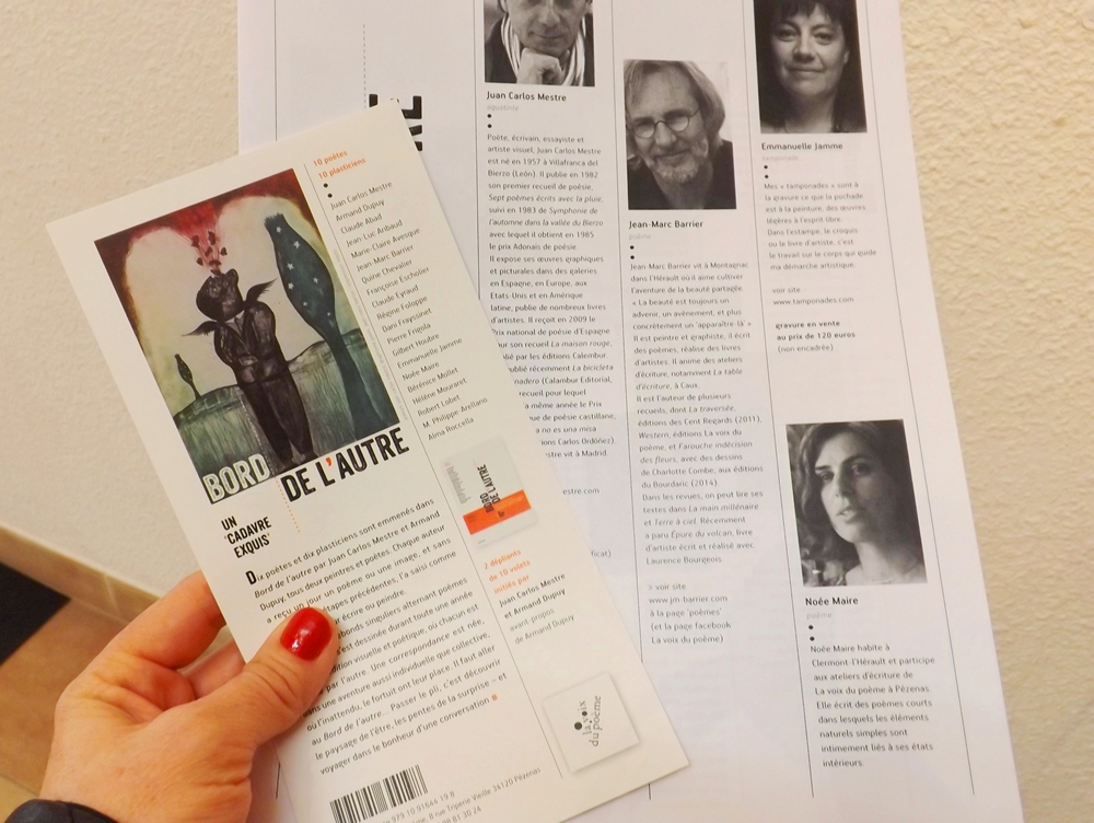 Au abords du village d’Octon existe un ensemble de petites constructions de pierres composant le Village des Arts et Métiers. C’est vraiment étonnant et réjouissant de trouver un lieu dédié à la création artistique et à la rencontre des arts vivants dans un si petit village. Tout au long de l’année des expositions y sont organisées. Dans le cadre du Printemps des Poètes, l’association « La Voix du Poème« , qui organise des ateliers d’écriture poétique à Pézenas, y présente « Bord de l’autre », sorte de « cadavre exquis » alternant poèmes et peintures. Ce samedi à 17h nous accompagnions ma mère au vernissage de cette aventure artistique, fiers qu’un de ses poèmes fasse partie de l’oeuvre !