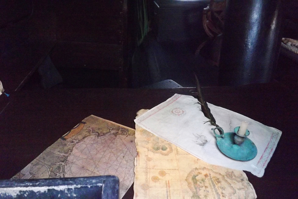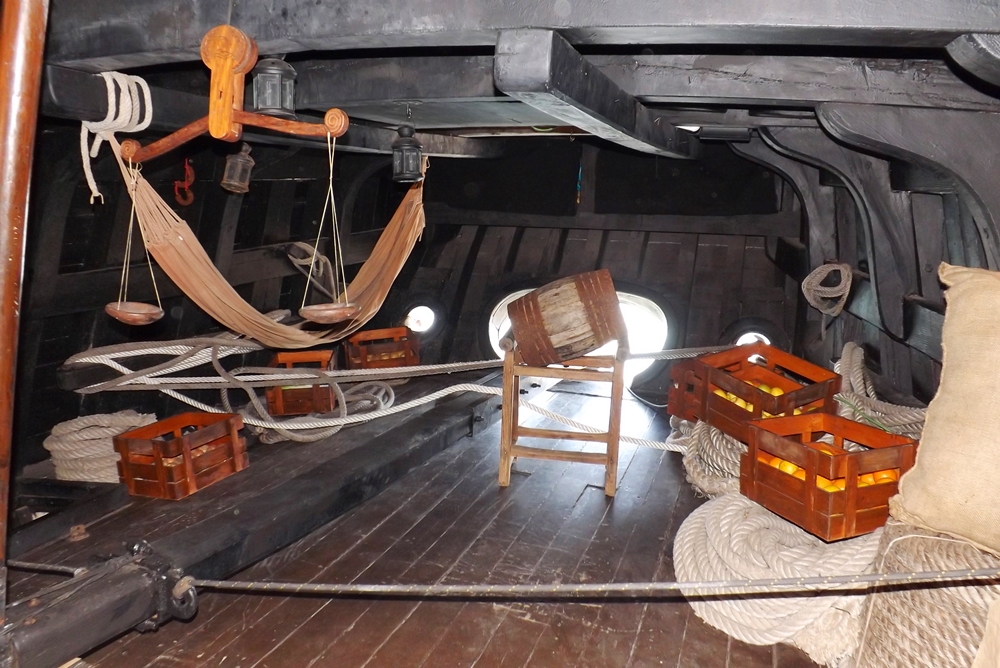 Ce bateau tout noir est une caraque. C’est tout petit !  27 mètres de long sur 7 de large et il paraît qu’il y avait 45 membres d’équipage à bord… On se demande où ils dormaient, sûrement sur le pont, vu que seul le capitaine avait un lit dans une cabine.