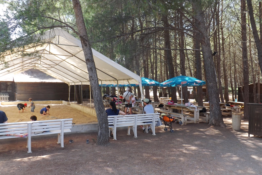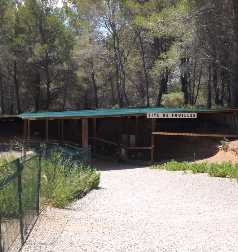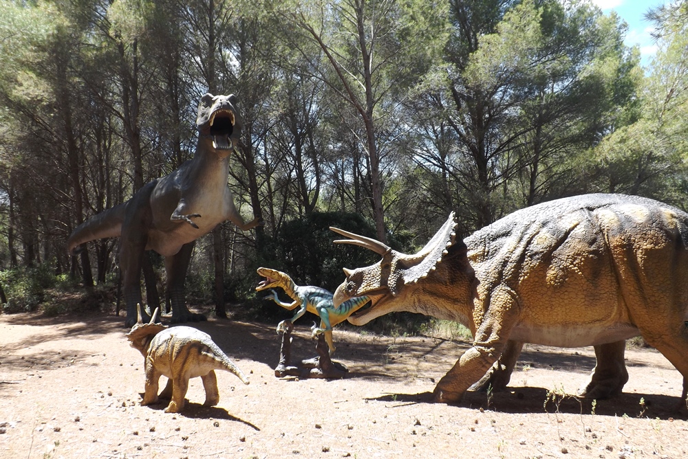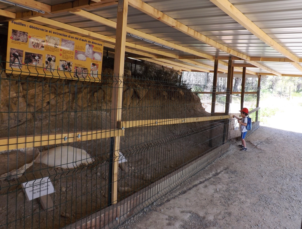 Hormis le parking qui est en plein soleil le reste du parc est ombragé. A l’entrée un grand espace comprend un espace de fouilles pour les enfants, des tables de pique-nique et une tente avec des bancs et un écran pour visionner le film expliquant l’histoire de la découvert de ce gisement paléontologique. Ensuite il suffit de suivre le parcours fléché à travers la pinède pour découvrir les dinosaures reconstitués.