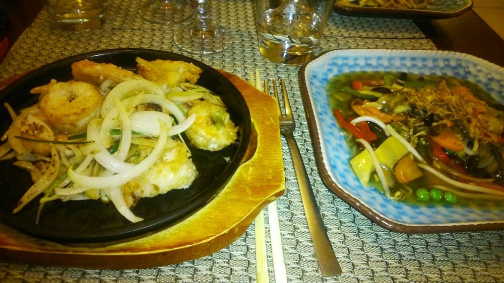 En plat principal j’ai craqué pour de succulentes crevettes sautées et Frédéric de très bonnes nouilles sautées.