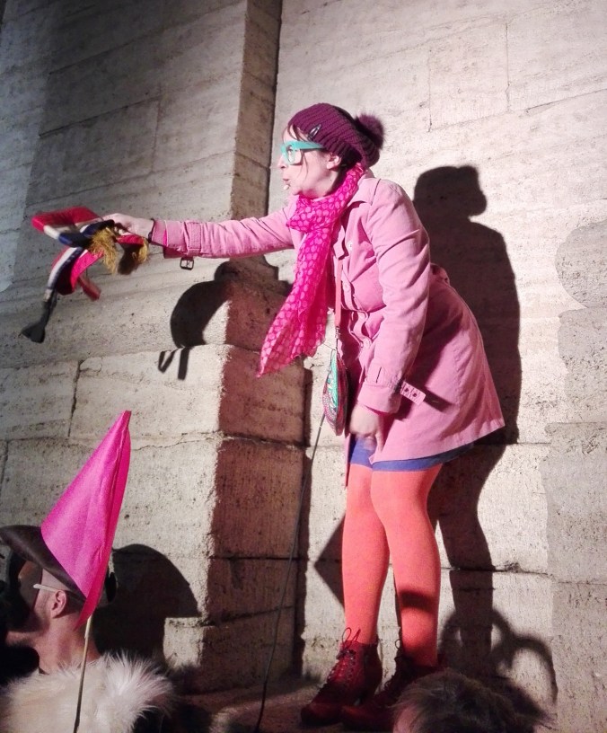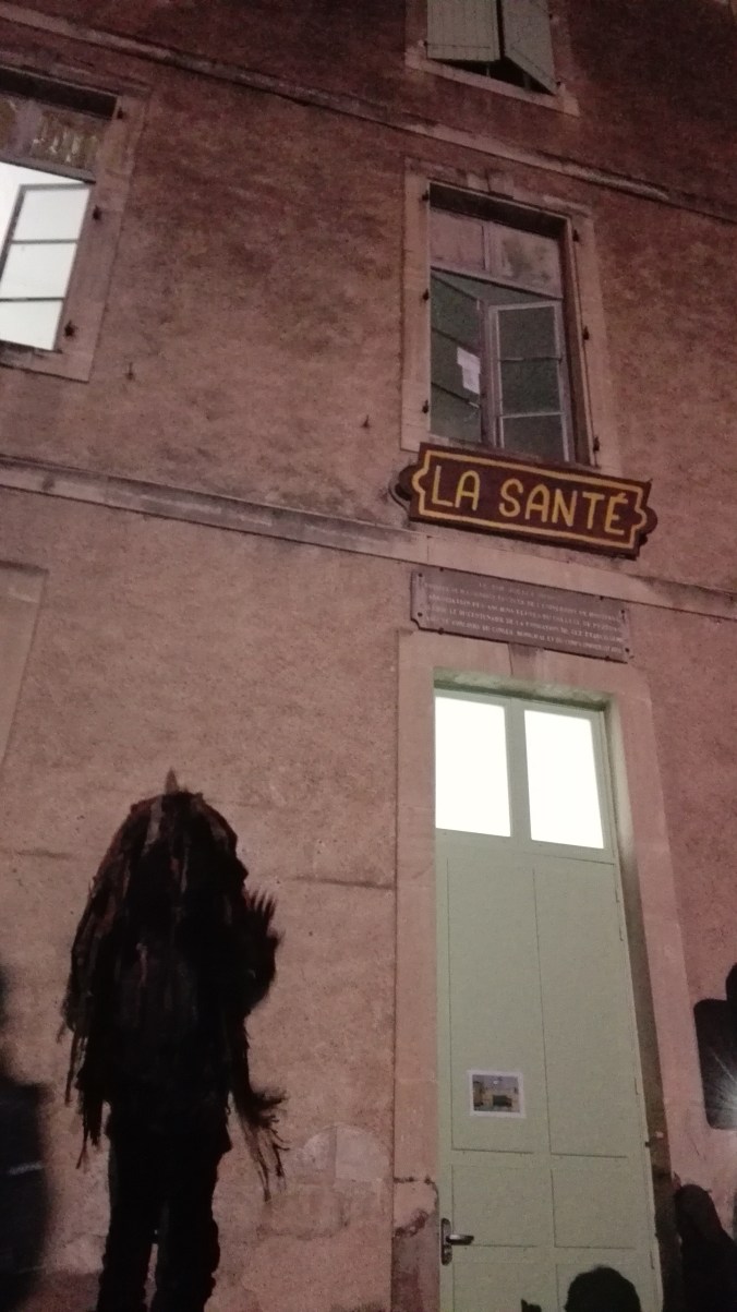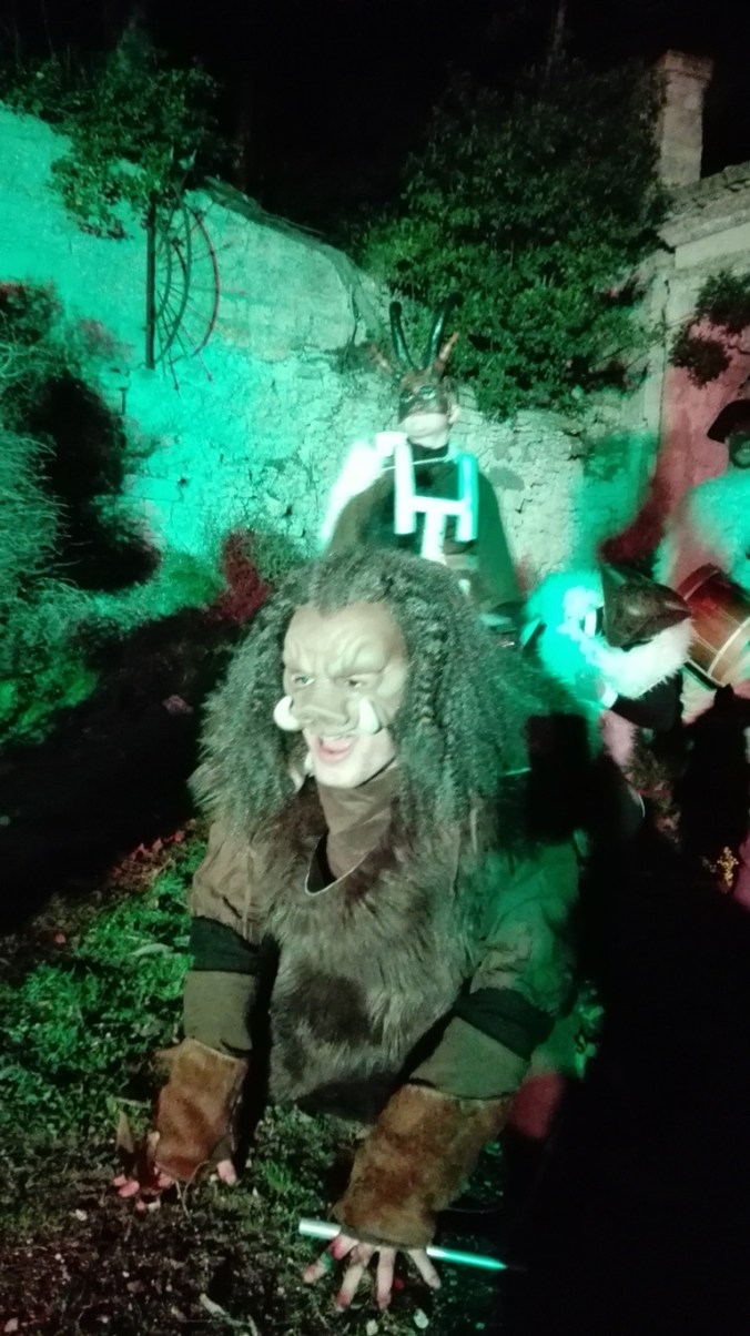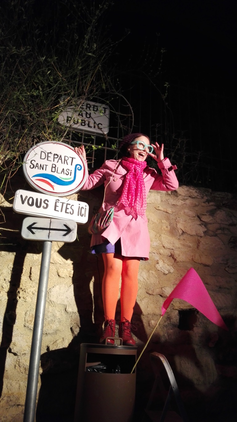 Les premiers spectateurs arrivent, certains nous demandent qui on est. Il faut dire que Delphine-Denise est joliment voyante. Soudain c’est à nous d’entrer en scène, Delphine passe devant en clamant son rôle de guide, nous suivons en prenant des photos à tort et à travers, les flashs crépitent. Notre guide s’installe sur sa poubelle (on fait avec les moyens du bord) et explique Saint Blaise (voir plus haut). Elle est parfaite. Elle redescend de son piédestal et nous ouvrons les portes qui mènent à la Butte du Château pour voir la Sauvagine.