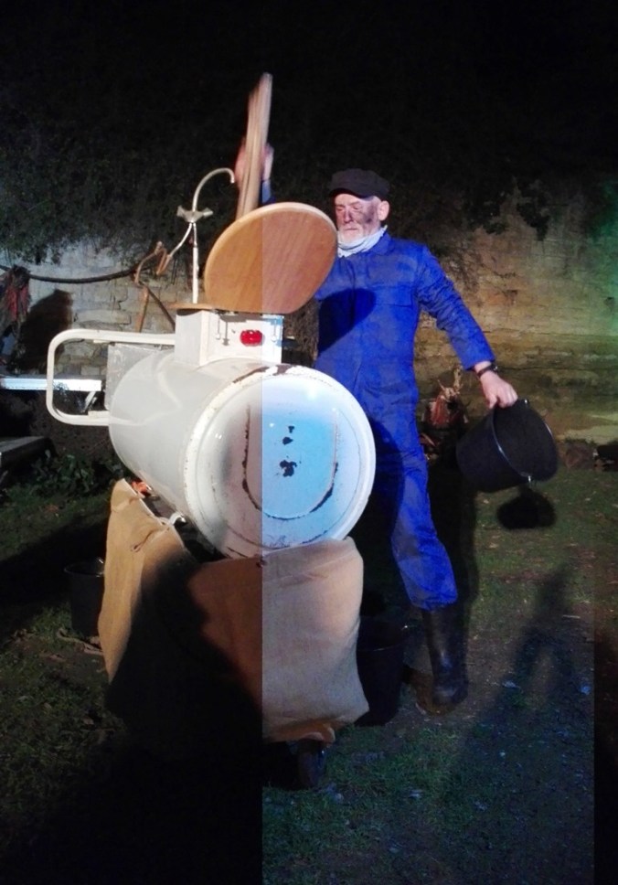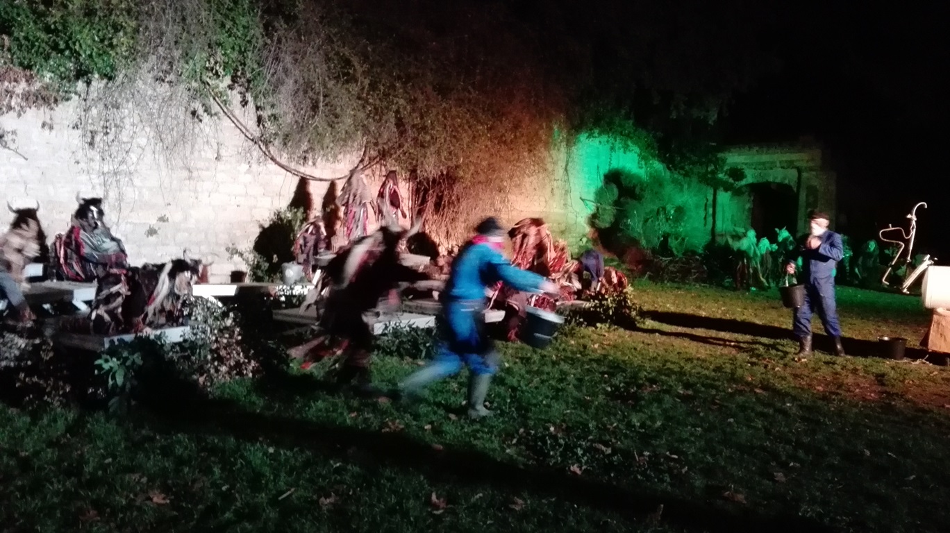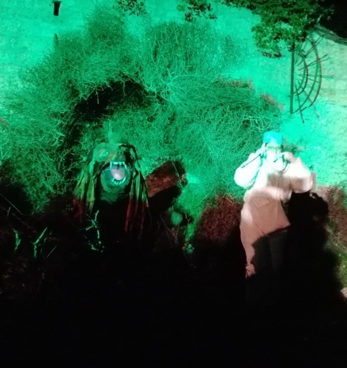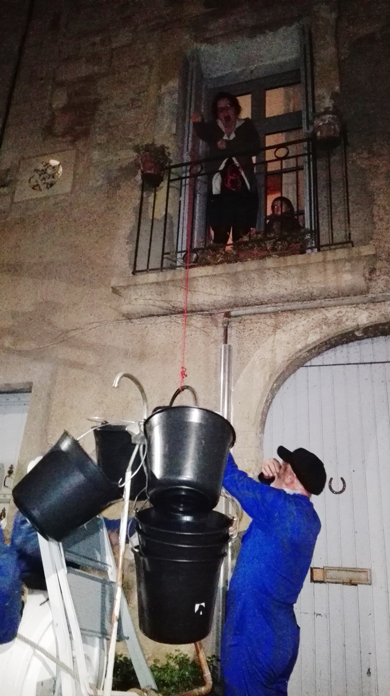 Les premiers spectateurs arrivent, certains nous demandent qui on est. Il faut dire que Delphine-Denise est joliment voyante. Soudain c’est à nous d’entrer en scène, Delphine passe devant en clamant son rôle de guide, nous suivons en prenant des photos à tort et à travers, les flashs crépitent. Notre guide s’installe sur sa poubelle (on fait avec les moyens du bord) et explique Saint Blaise (voir plus haut). Elle est parfaite. Elle redescend de son piédestal et nous ouvrons les portes qui mènent à la Butte du Château pour voir la Sauvagine.