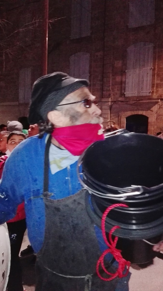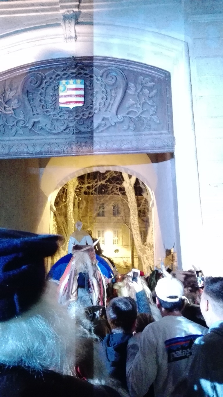Par expérience je sais qu’il vaut mieux ne pas rester au milieu de la population quand le Poulain débarque, il a tendance à déchaîner les passions. Donc hop, je me faufile, telle la belette, vers ce que je sais être la suite des événements. Me voici donc avec mes copains Saint Blaise, les Capitouls et les Tinetteurs. Nous sommes positionnés en avant du Poulain, ce qui nous laisse un peu de répit. Nous profitons du calme, on papote, on rigole, Fernand se gèle dans sa chemise légère.