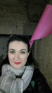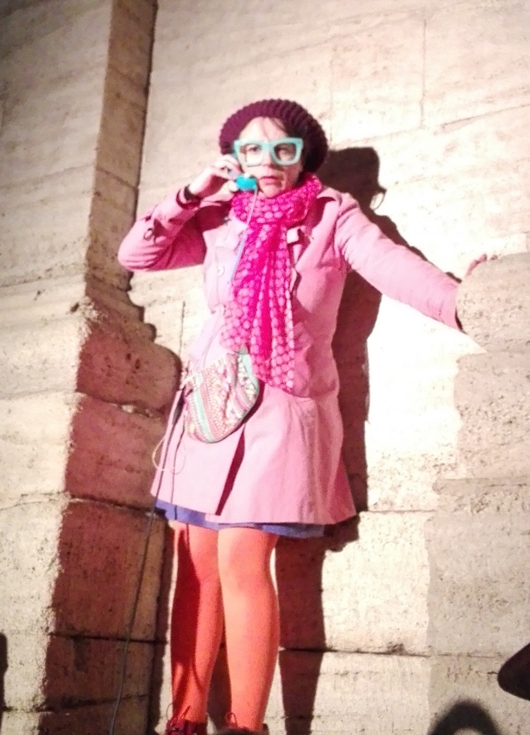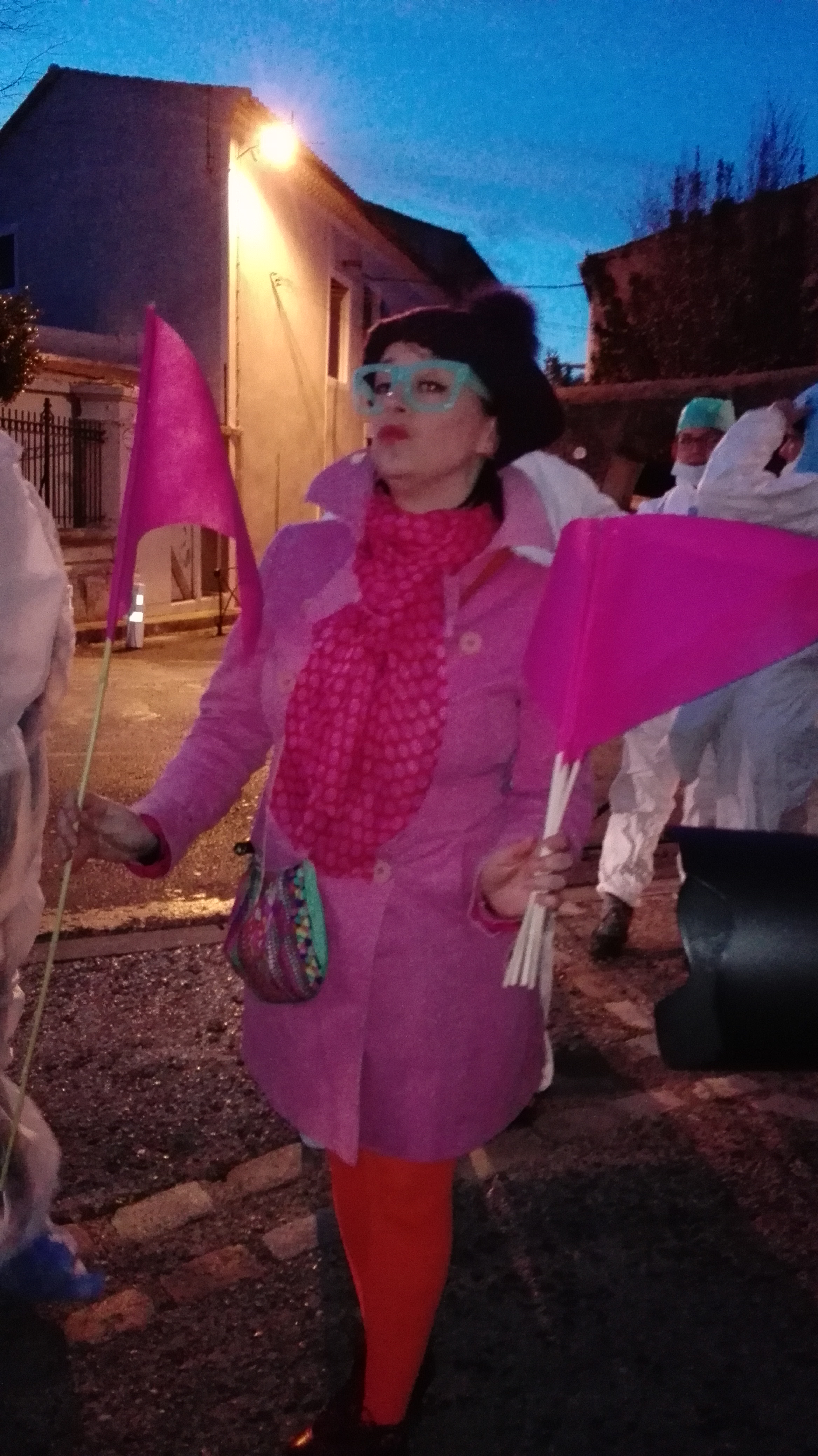 Le spectacle commençait à 19h devant le portail de la Butte du Château et j’avais dans l’idée de rejoindre les acteurs au Foyer des Campagnes, lieu des préparatifs (costumes et maquillages). Je fis d’abord un crochet par le Cours Jean Jaurès, vidé des véhicules habituellement en stationnement, puis par la mairie car une partie du spectacle devait y avoir lieu. Et là pouf je constate avec effroi (si si les soirs de spectacle on a le droit d’être en mode drama queen) qu’il y a des véhicules stationnés alors qu’il ne devrait pas y en avoir #maisquefaitlapolice! Puis je file vers le Foyer des Campagnes. Il est 18h30, j’aperçois au loin une partie des différents acteurs à l’extérieur. Clic clac deux trois photos, puis Delphine, toute rose tel un bonbon anglais, me tend un fanion et me propose un rôle… comme ça au débotté!!!!  Et là je sens que ma vie va prendre un tournant, que c’est la chance de ma vie, je suis prise de vertige, je dis OK ! Comme quoi une carrière ça te tombe dessus sans crier gare (en même temps mon effroi devant la mairie était un signe évident de ma capacité à incarner les émotions les plus fortes).