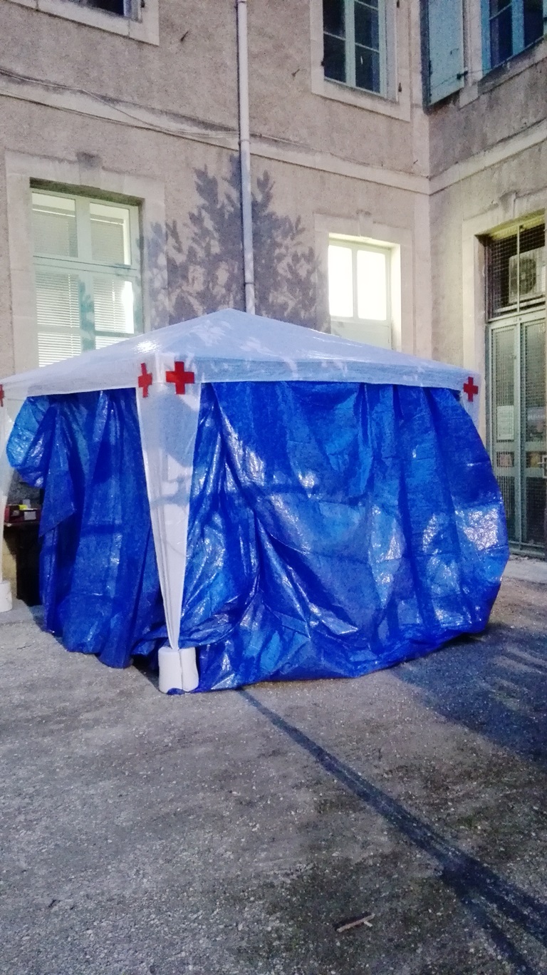 Panneau et serrure  de G. Garcia. Dispensaire créé au dernier moment pour cacher un barnum qui n’était pas censé être là