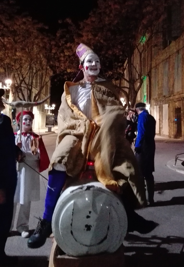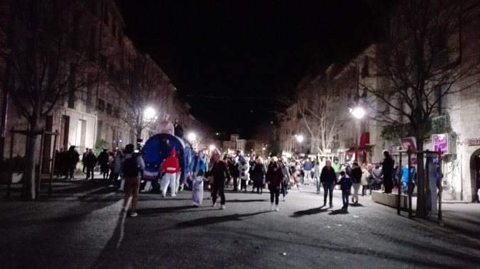 Après ma journée de travail et une fois arrivée à mon domicile je fis l’impasse sur mon five o’clock tea (noir avec un cumulo-nimbus de lait froid), boisson absolument incompatible avec ma petite vessie et la perspective de deux heures  dehors dans un froid de semi-gueux (on est dans le sud faut pas pousser non plus).  Après un chocolat chaud délicieusement régressif et une douche apaisante et stimulante à la fois, j’étais quasi prête. Il ne manquait plus qu’à disposer mon attirail dans mon sac-à-dos : mes gants et mon bonnet en laine mais également des petites bouteilles d’eau et des pailles. Ma mission étant, si je l’acceptais, et je l’acceptai car les défis ne me font pas peur, d’hydrater certains acteurs durant le spectacle déambulatoire.