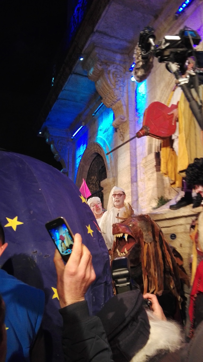 Nous nous hâtons vers la Place Gambetta pour prendre place devant la Maison Consulaire. Saint Blaise s’installe sur la fontaine, entouré de tous les acteurs  les Capitouls, la Sauvagine, les Médecins, les Vieilles et l’Ours. Je tente de me placer à un endroit où je pourrai voir à peu près bien le déroulement du baptême du Poulain. C’est pas super easy vue ma taille (1,57 m TTC).