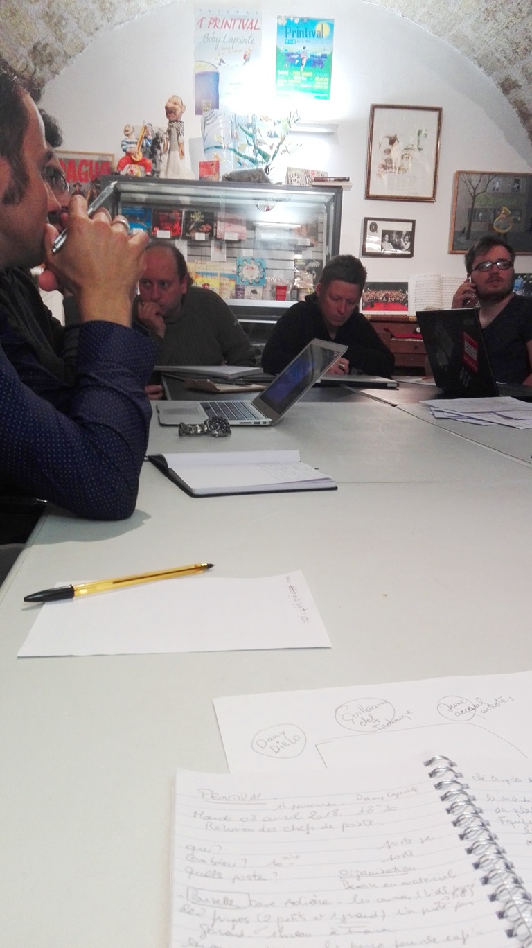 J’ai participé à une réunion à l’A-Musée Boby avec une partie de la Printi’Team la semaine dernière. C’était une réunion avec les chefs de poste pour faire le point sur l’organisation et les besoins en matériels. Il y avait :