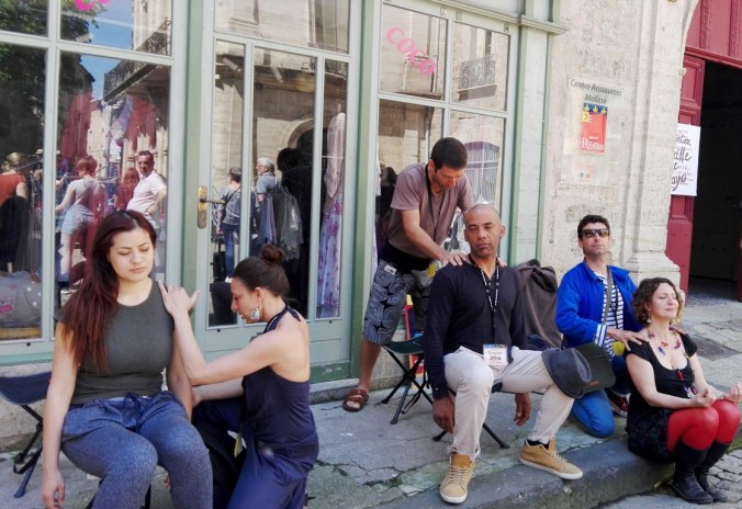 J’ai testé celle d’Anthéa jeudi midi sur la place Gambetta où je m’étais rendue pour écouter le concert gratuit du midi. Tout était délicieux : le climat, l’ambiance, le verre de vin blanc (dégustation du Domaine de la Font des Ormes), le sourire solaire d’Anthéa, le public alentour… et bien sûr le massage ! Vous savez, un de ces moments que vous aimeriez suspendre dans le temps, qu’il ne cesse jamais…