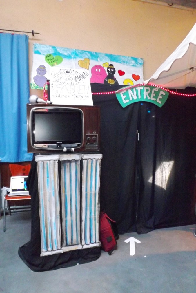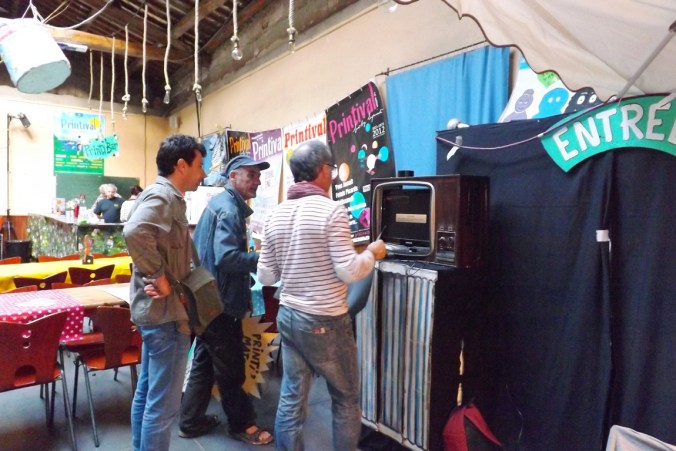 Car à partir de 18h environ ils migrent vers le Foyer des Campagnes, lieu de rassemblement avant, pendant et après les concerts. La buvette y est installée, tout comme le coin pour les masseurs, et le coin des dessinateurs. C’est ici que cette année Fabien a installé le vidéomaton du Printival. Idée géniale qui permet aux gens présents de donner leurs ressentis sur leur journée, leur coup de coeur ou coup de gueule. Ensuite Fabien visionne, coupe, monte et le résultat est visible le lendemain. J’adore.