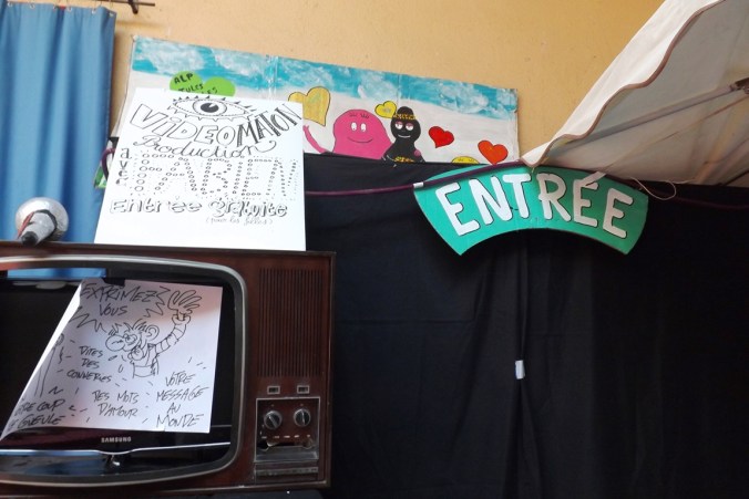 Crub se cache derrière son grand écran et Fabien prépare le montage du vidéomaton. Steff veille sur les bananes mine de rien.