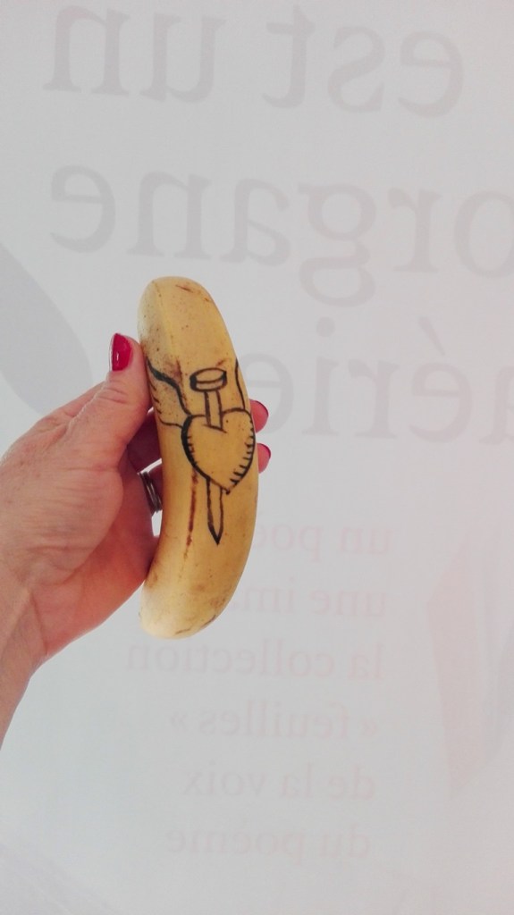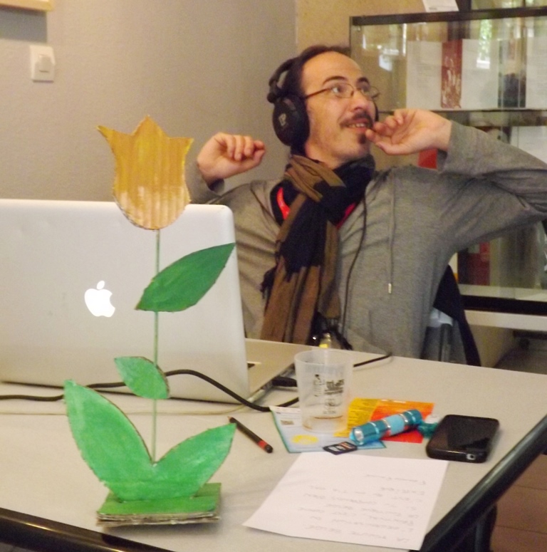 J’aide Fabien à dégager et déplacer les tables puis à synchroniser ordi et écran, branchements des micros, etc. (Oui, bon, quand je dis « je l’aide »… Il me demande « ça s’affiche là ? » et moi je réponds oui ou non…)