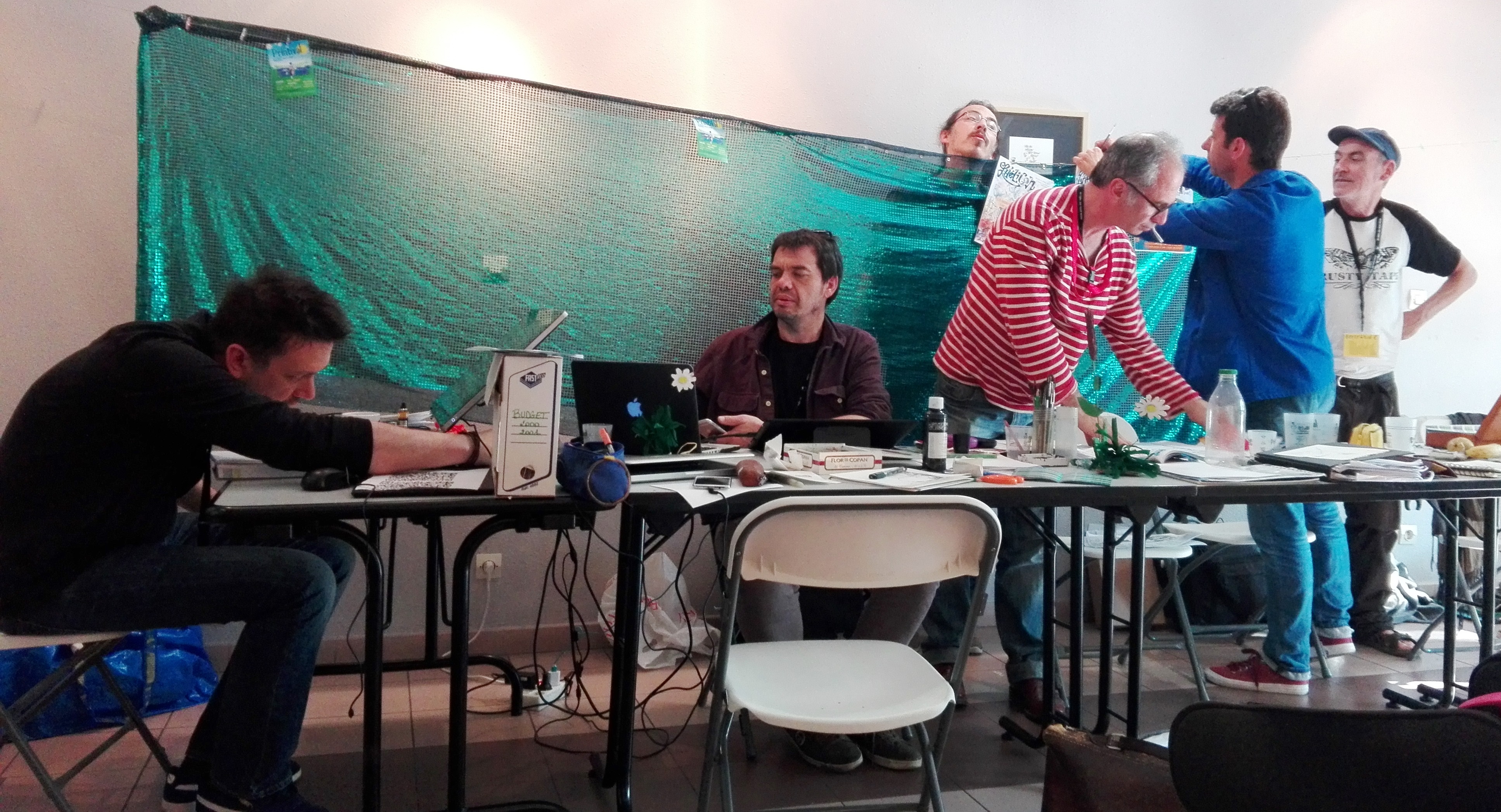 A l’heure dite Jean Montussac de RPH arrive avec son matériel pour faire son interview. Je suis assise à la petite table où Camille avait écrit ses articles, les sept dessinateurs de l’Hélicon sont présents.